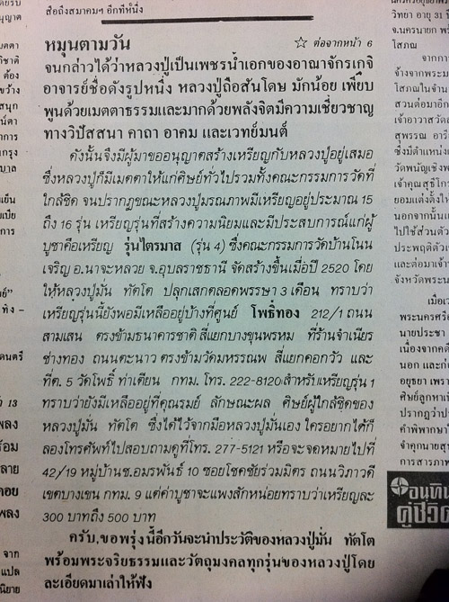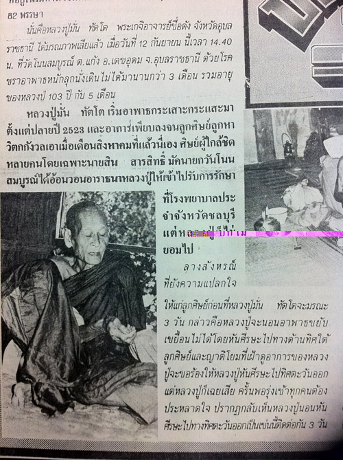 ข้อมูลจากหนังสือพิมพ์ดาวสยาม ในวันที่ 16-17 กันยายน 2524 ซึ่งได้จัดพิมพ์ข้อมูลหลวงปู่เพียงบางส่วน หลังจากหลวงปู่ได้มรณะภาพในวันที่ 12 กันยายน 2524 รวมอายุ 104 ปี 82 พรรษา